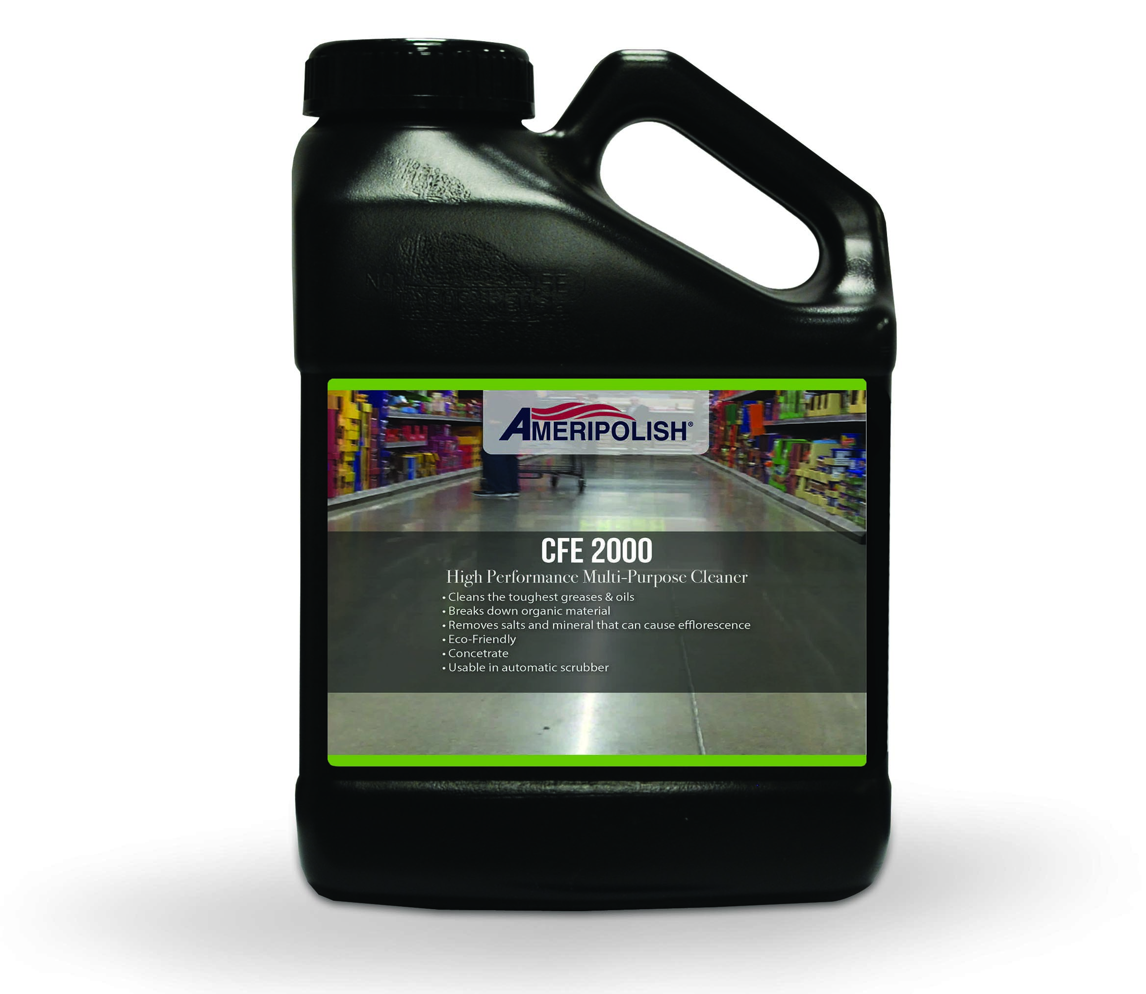 Ameripolish® CFE 2000 is our latest cleaning solution designed to break down the toughest and most troublesome stains. CFE 2000 is very effective in environments where other aggressive chemicals are unsuccessful. CFE 2000 is eco-friendly and comes in a concentrate intended for automatic scrubber use.